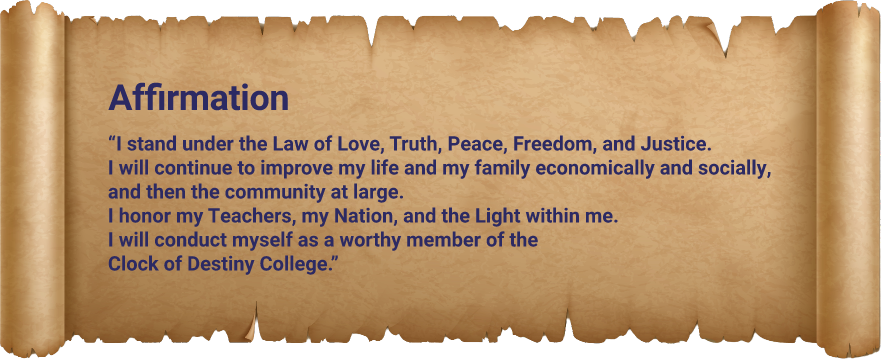 The College offers ten (10) core lessons, required readings, and a natal chart study. Completion of these initiatic steps affirms entry into the Brotherhood and Sisterhood of the Clock of Destiny College.